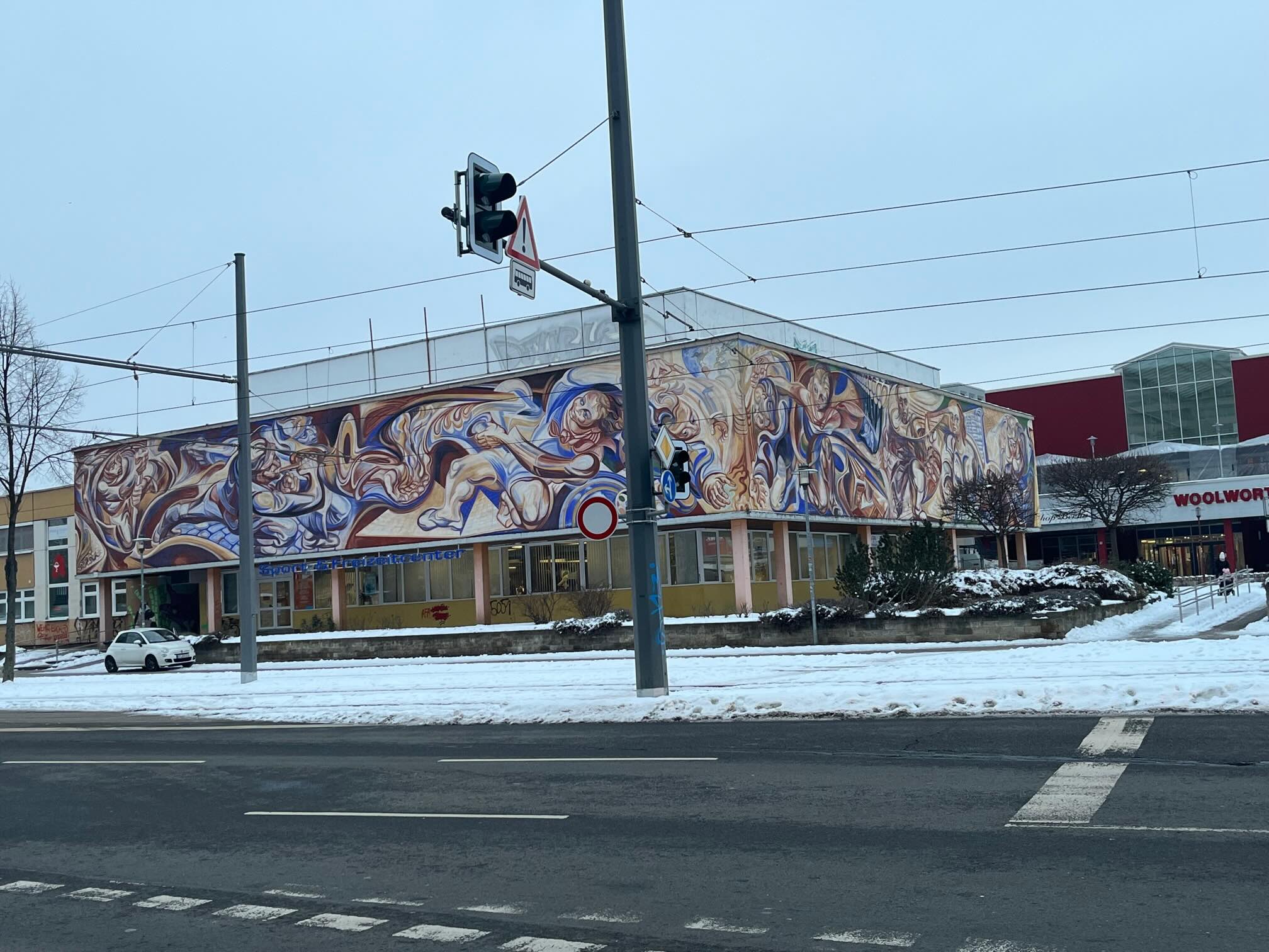 Abplatzungen an Farbe und Putz und Vandalismusschäden sind zu beklagen. Und dennoch: Die Farben und Motive entfalten seit fast einem halben Jahrhundert auf einem Großteil der riesigen Fläche von 612 Quadratmetern eine beeindruckende Wirkung. Das Wandbild gehört zu den größten Europas.