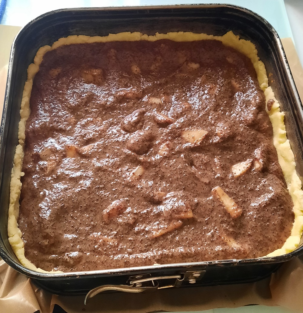 Apfelmus und Birnen unter die Mohnmischung heben und auf dem Teig verteilen. Bei 75-180 Grad O/ U ca.  40 Minuten backen,  abkühlen lassen.